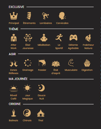 Vous trouverez des programmes thématiques comme "After Work" pour détendre vos muscles après une journée intense, "Élixir Jeunesse" pour revitaliser votre corps, ou "Douce Nuit" pour faciliter l’endormissement grâce à des gestes doux et enveloppants. D'autres programmes ciblent des zones spécifiques telles que les lombaires, les cervicales, les jambes ou encore les pieds avec précision.